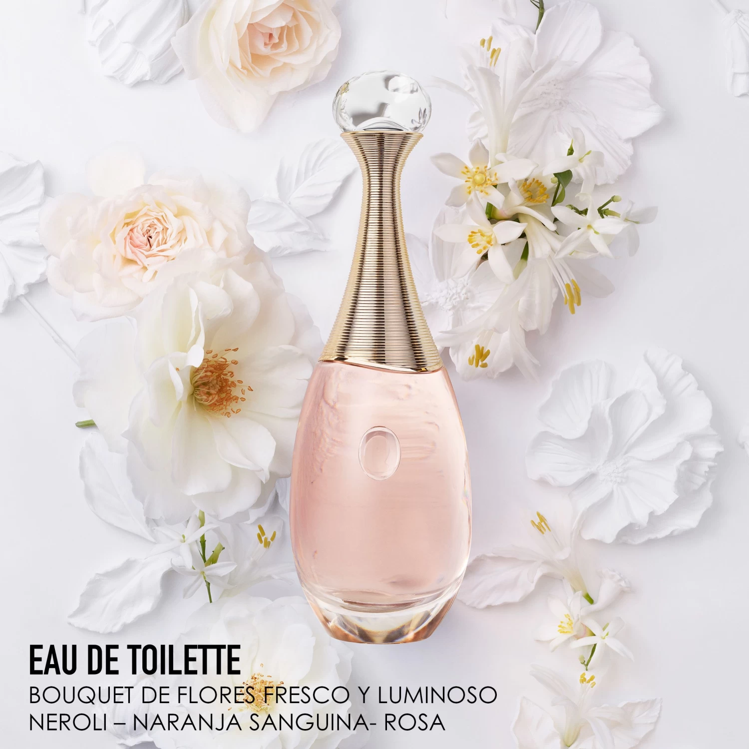 J’adore Eau de toilette combina ingrdientes chispeantes y luminosos: la esencia de naranja sanguina, en nota de salida, estimula los sentidos. El neroli, en nota de corazón, es radiante y chispeante como el sol del Mediterráneo. Las notas de esencia de rosa damascena, sensuales y lácteas, aporta confort a la composición.