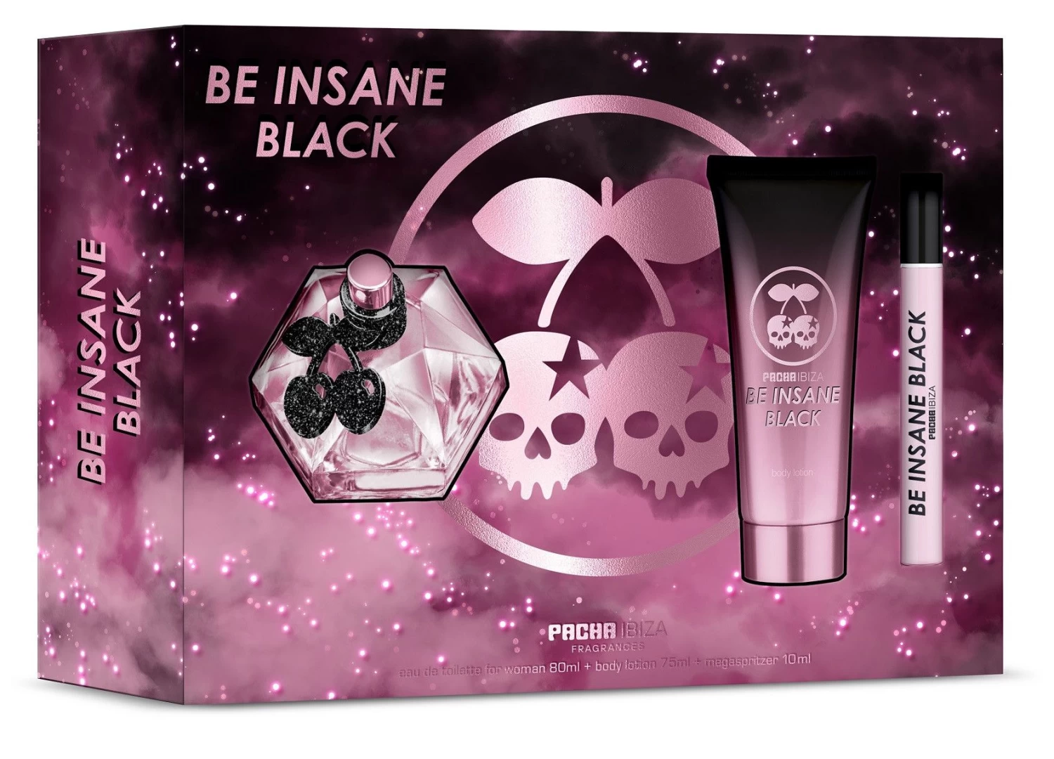 Una fragancia floral ámbar inspirada en las luces de la pista de baile que te hará brillar. Su packaging representa el más puro espíritu Pacha, con las míticas cerezas reconvertidas en calavera, el símbolo de la diversión de esta fiesta sin fin.