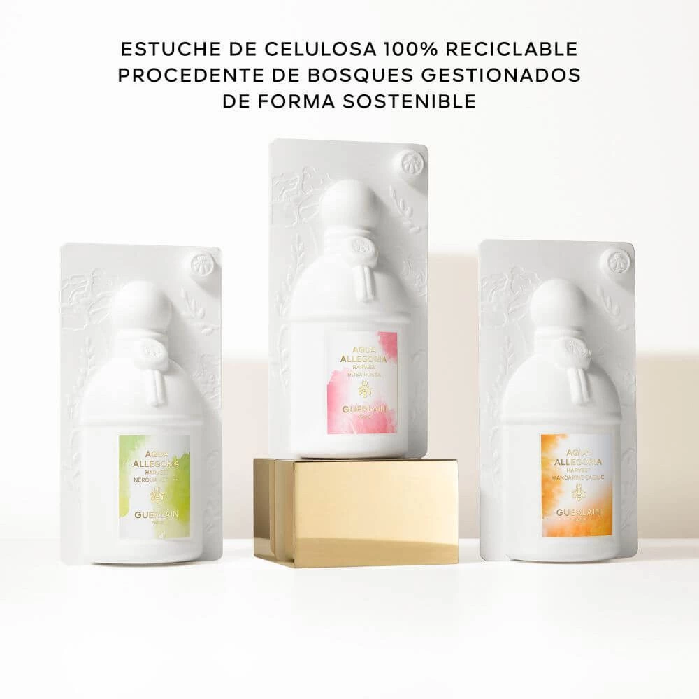 Las fragancias Aqua Allegoria, símbolo innegable del compromiso de Guerlain con el planeta, se componen de hasta un 95 % de ingredientes derivados de la naturaleza *. El alcohol de remolacha francesa que se incluye en sus fórmulas procede de una cadena de suministro comprometida con la agricultura responsable.